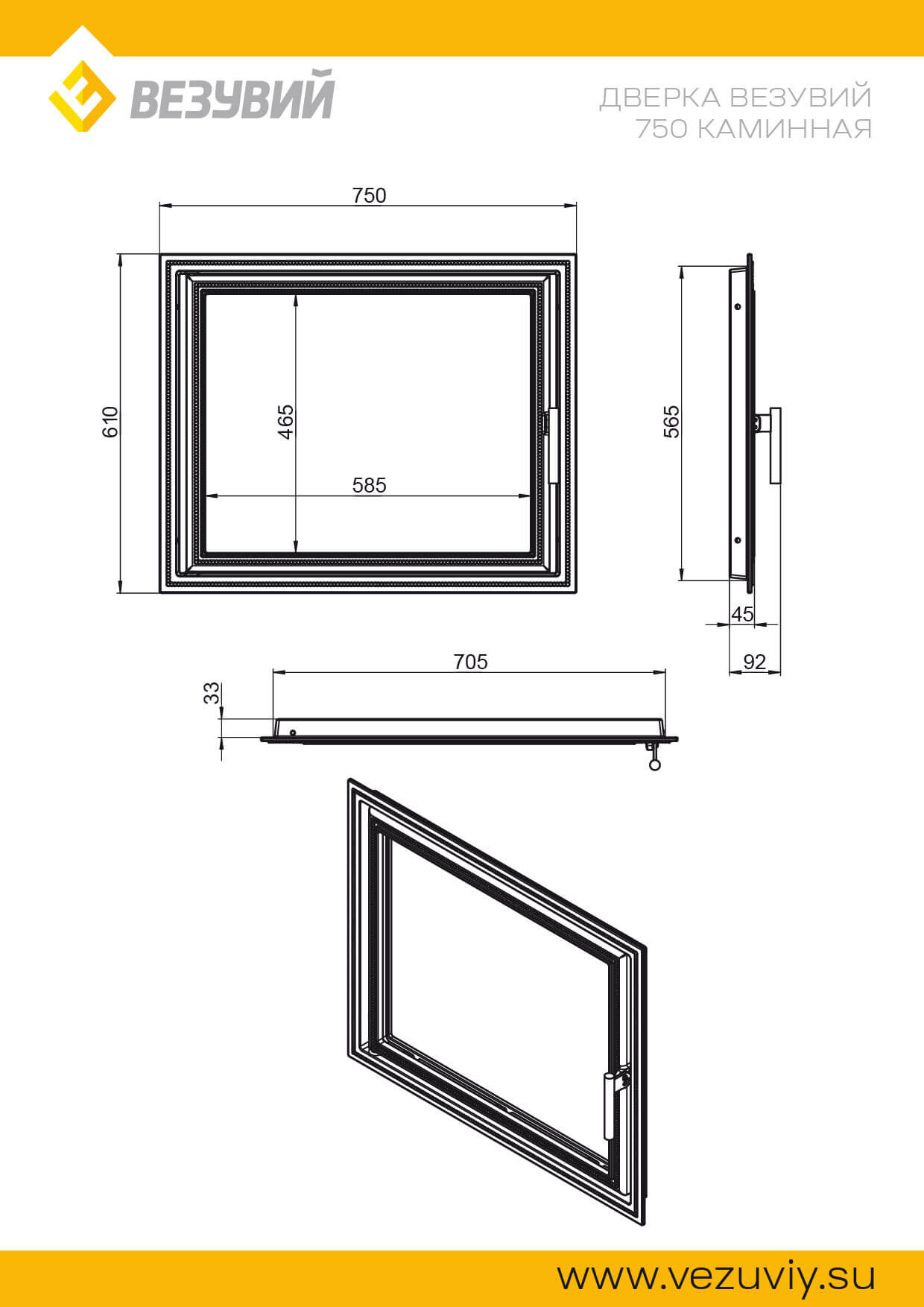 Двери изготовлены из качественного чугуна по ГОСТ 1412-85, производятся в комплектациях с глухим полотном или стеклом. Ручки дверей также сделаны из чугуна.