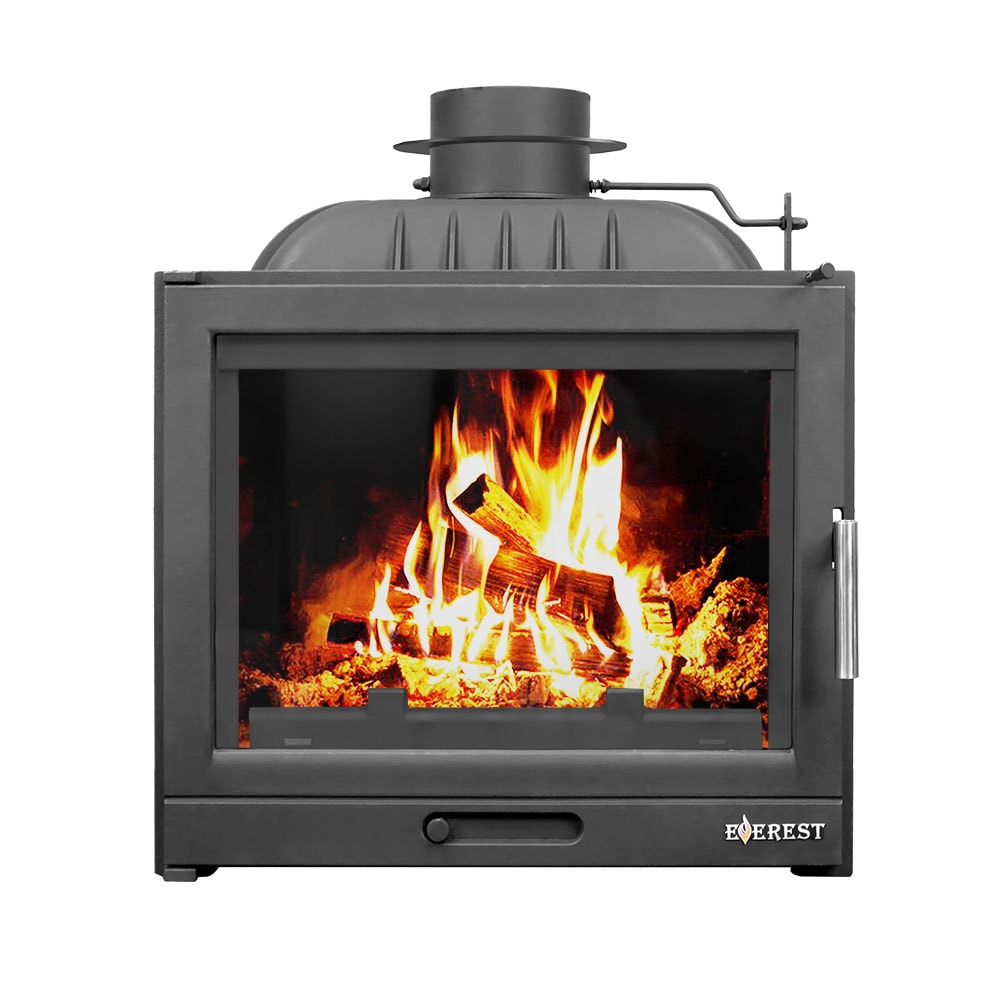 Каминная топка EVEREST U10 изготовлена из качественного жаростойкого чугуна (ГОСТ 1412-85) с толщиной стенок 6-10 мм. Вес топки составляет 98 кг. Модель рассчитана на обогрев помещений объёмом до 200 м³. Топка усилена чугунными вставками с системой вторичного дожига. С помощью этой функции по каналам подачи вторичного воздуха поступает воздух, который нагревается при прохождении между топочной камерой и стенками корпуса. Далее нагретый воздух через дефлектор поступает в топку, перемешивается с газами - продуктами горения, чем вызывает повторное возгорание. Патрубок дымохода диаметром 150 мм не универсальный. оснащён поворотным шибером. Заслонка сделана из чугуна, а её положение регулируется ручкой на передней панели топки.