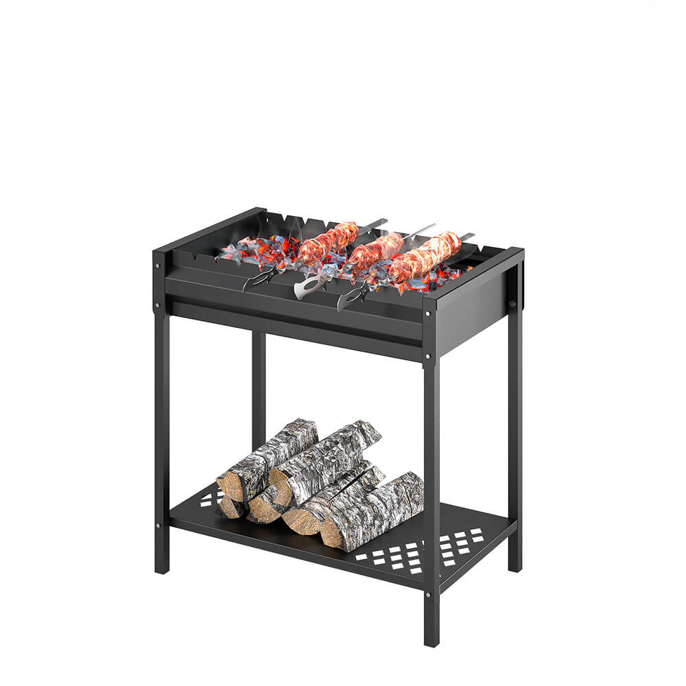 Сборная подставка мангала Кулинар 1 оснащена дополнительной полкой для хранения топлива в нижней части подставки.
