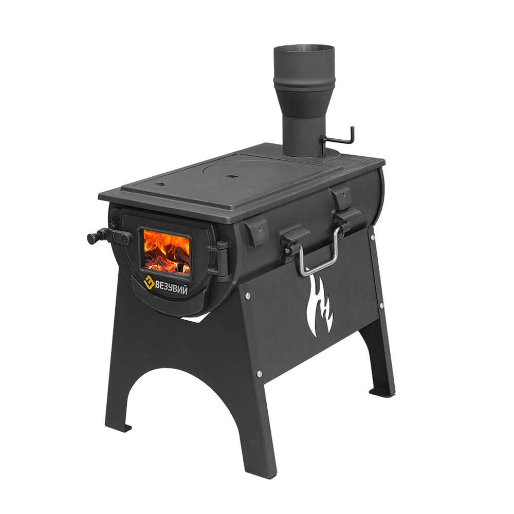Походная печь - Везувий Travel, чугунная топка с плитой на подставке, печь со стеклом, возможно установка дополнительных плит и решеток -гриль.