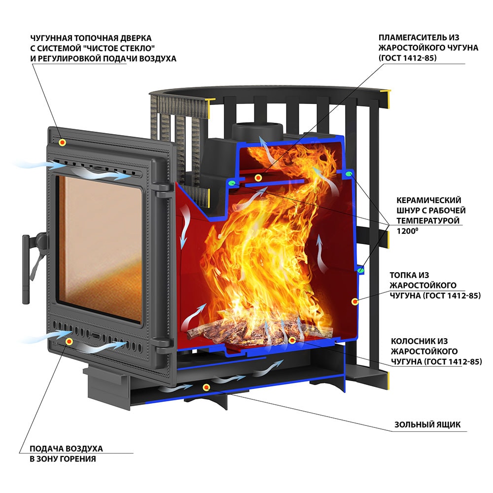 Преимущество печи в том, что топка печи состоит из 3-х элементов. На стыке между ними используется керамический шнур с рабочей температурой 1200 градусов. То есть топка печи абсолютно герметична! Для фиксации деталей между собой применяется болтовое соединение, что даёт 100% гарантию безопасности при эксплуатации.