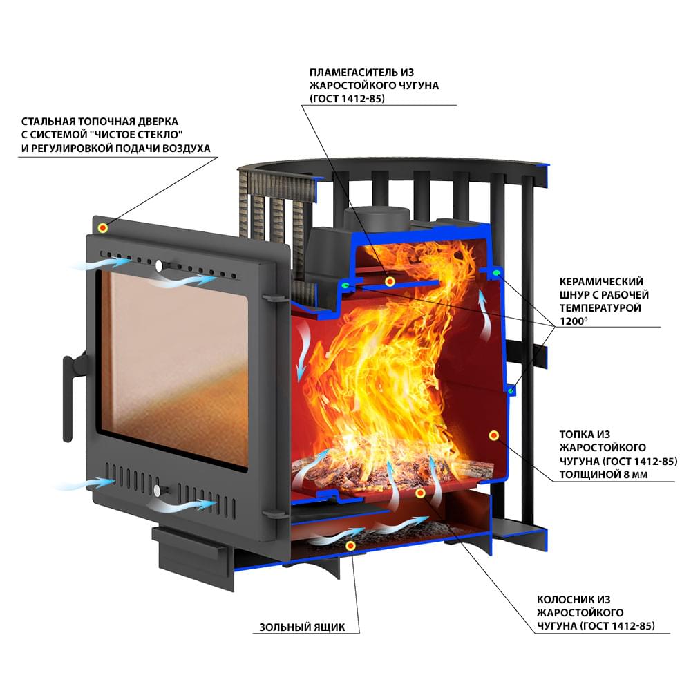 Преимущество печи в том, что топка печи состоит из 3-х элементов. На стыке между ними используется керамический шнур с рабочей температурой 1200°C. То есть топка печи абсолютно герметична! Для фиксации деталей между собой применяется болтовое соединение, что даёт 100% гарантию безопасности при эксплуатации.