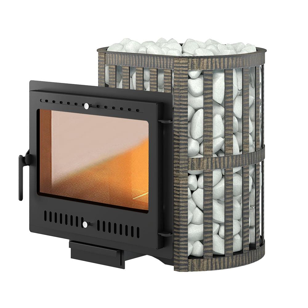 Банная чугунная печь Легенда Ковка 22 Панорама "М" укомплектована металлической герметичной дверцей Везувий Панорама "М". Конвекционно-вентилируемый кожух "Ковка" изготовлен из металлической текстурированной полосы покрашенной термостойкой краской и покрытая патиной «Бронза».